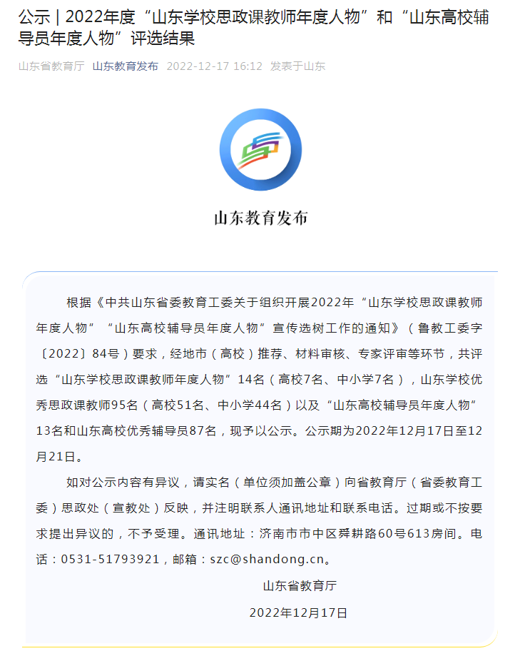 据悉,本次评选根据《中共山东省委教育工委关于组织开展2022年“山东学校思政课教师年度人物”“山东高校辅导员年度人物”宣传选树工作的通知》(鲁教工委字〔2022〕84号)要求,经地市(高校)推荐、材料审核、专家评审等环节,共评选山东学校优秀思政课教师95名(高校51名、中小学44名)。