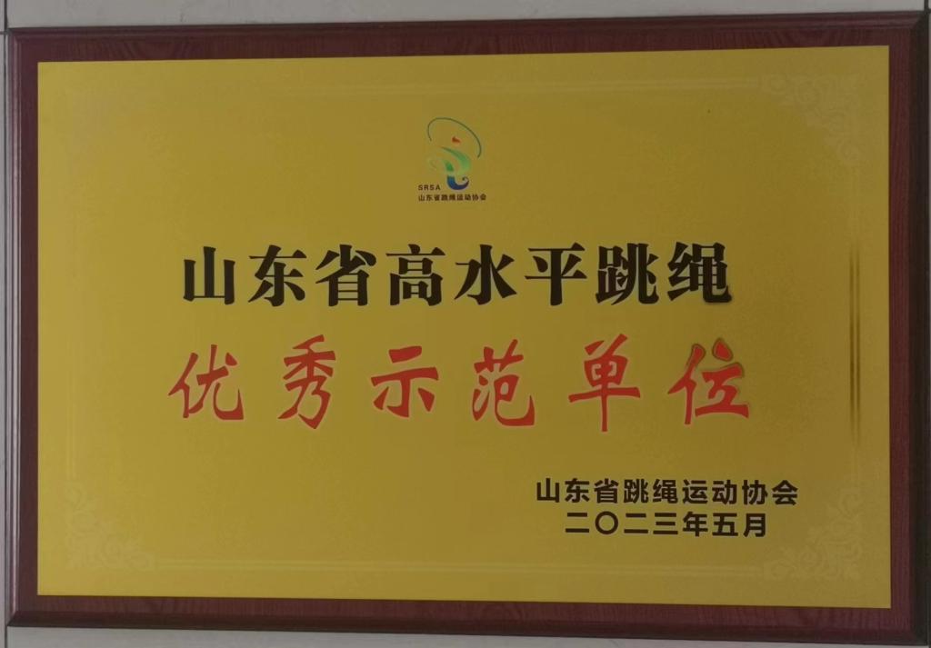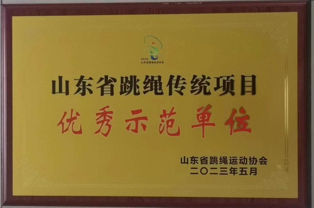 2023年,经专家评审,我校顺利通过首批山东省跳绳(优秀)示范单位验收,准予结项并颁发牌匾!今后,我们将继续努力,为跳绳项目的普及与推广做出更多的贡献。