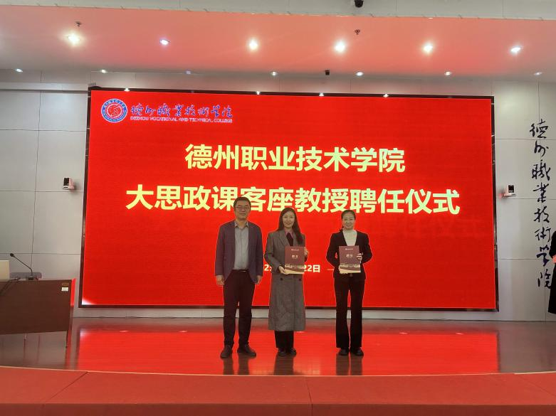 为持续深化“大思政课”建设,推动校地协同育人走深走实,2025年10月22日下午,我校在思政VR实践教学中心举行“大思政课”客座教授聘任仪式。马克思主义学院院长徐锐为宁津县文化旅游事业发展中心主任张洋、宁津县文化艺术中心展览管理股股长魏颖颁发“大思政课客座教授”证书。全体思政课教师及部分学生代表参加活动。