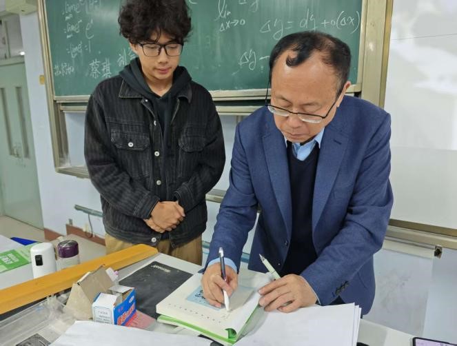 现场气氛活跃,张教授通过互动问答调动学生参与积极性,对同学们提出的问题逐一细致解答,并鼓励大家勇于挑战、夯实基础、追求卓越。期间,他还向积极作答的同学赠送了精心挑选的数学教材作为奖励。在报告尾声,张教授在赠书上亲笔写下寄语,勉励学子勤学善思、勇攀数学高峰。