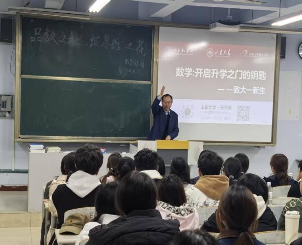 在漫漫学习路中,数学总像一座难以攀登的山峰,让不少同学望而却步。函数、极限、微分、积分……一个个知识点如同拦路虎,阻碍着学生前进的脚步;数学,宛如一座神秘的宝藏岛屿,又充满了挑战与惊喜。为推动创新型人才培养,激发我校学生数学学习热情,助力学生跨越阻碍,畅游数学知识海洋,2025年11月3日,基础部邀请山东大学数学学院教授、山东省教学名师、泰山学堂卓越讲师张天德教授以“数学:开启升学之门的钥匙”的主题讲座,培训由基础部主任徐锐主持,文理教研室教师及百余名师生参加了本次讲座。